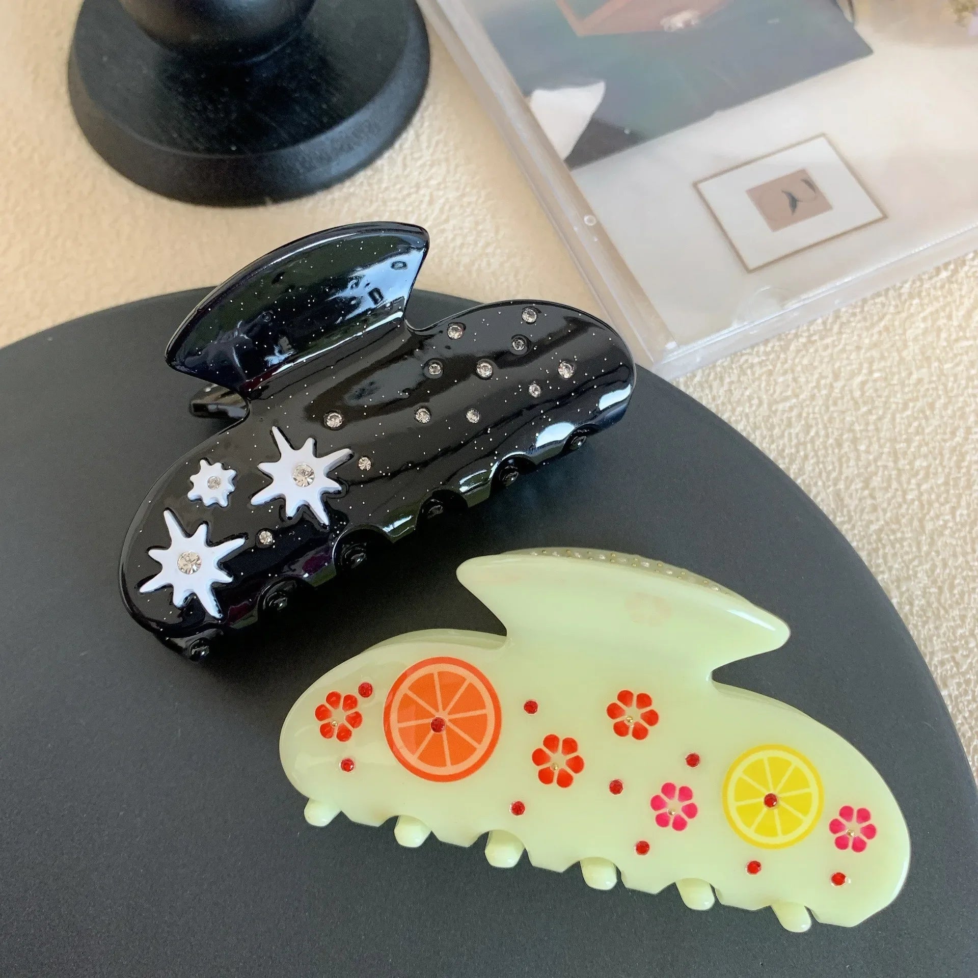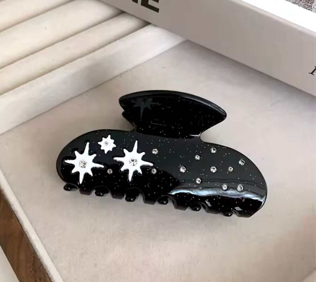 Enhance your style with our captivating Midnight Sky Hair Clips, designed to perfectly complement any look. Designed to dazzle, it effortlessly secures even the fullest heads of hair, ensuring your style stays flawless from morning until the stars come out. Experience the utmost comfort and functionality without any tugging or discomfort. Say goodbye to headaches and hello to fabulous hair. Whether your locks are dry or wet, this versatile claw clip is the perfect companion for any occasion.
